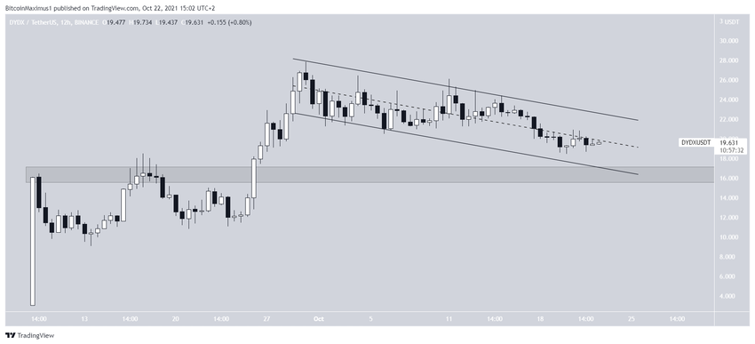 DYDX là mã thông báo gốc của sàn giao dịch tiền điện tử phi tập trung dYdX. Altcoin này đã đạt mức ATH là 27.85 USD vào ngày 30 tháng 9, nhưng kể từ đó đã giảm xuống trong một kênh song song giảm dần.