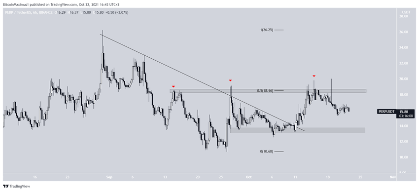 Sự tăng trưởng kéo dài cho đến ngày 15 tháng 10, sau đó PERP đã bị bật ra khỏi mức Fibo 0.5 của đợt điều chỉnh tại 18.50 USD. Trước đó, khu vực này đã hoạt động như một ngưỡng kháng cự vào ngày 14 và 26 tháng 9 (biểu tượng màu đỏ).