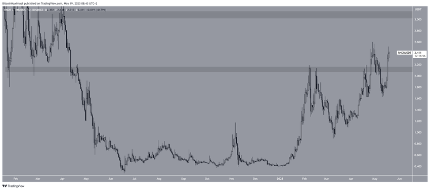 Giá RNDR đã tăng kể từ đầu năm. Vào đầu cuối tháng 4, RNDR đã di chuyển lên trên vùng kháng cự ngang 2.10 USD. Tuy nhiên, altcoin này đã giảm xuống dưới vùng này gần như ngay lập tức sau đó. Điều này cho thấy rằng sự gia tăng trước đó chỉ là một tín hiệu deviation (độ lệch).