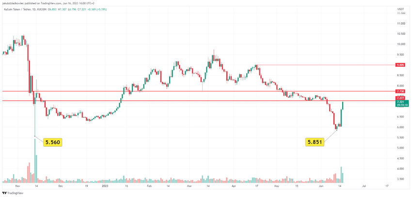 Tuy nhiên, FUD trao đổi gần đây do các hành động quản lý của SEC Mỹ gây ra đã ảnh hưởng đến giá KCS. Altcoin này đã mất hỗ trợ dài hạn ở mức 7.28 USD. Sau đó, mã thông báo gần như giảm xuống mức thấp mới, đạt 5.85 USD vào ngày 12/6.