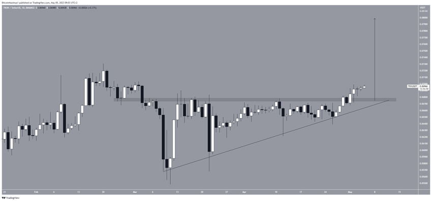Giá TRX đã tăng dọc theo đường hỗ trợ tăng dần kể từ ngày 10/3. Khi đường hỗ trợ được hợp lưu với khu vực nằm ngang 0.068 USD, điều này tạo ra một tam giác tăng dần, được coi là một mô hình tăng giá.