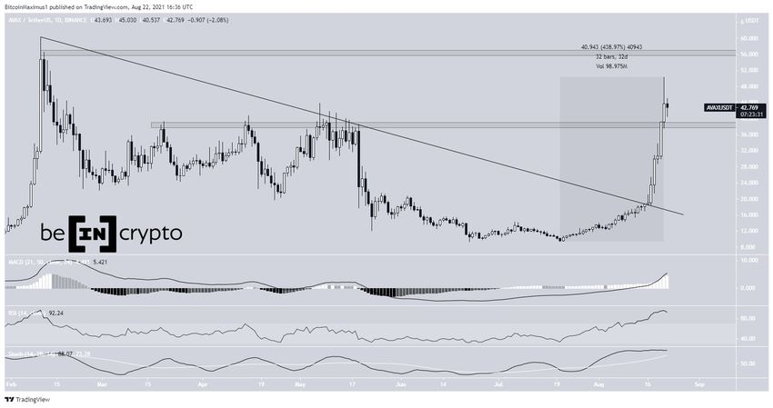Giá AVAX đã tăng nhanh với tốc độ chóng mặt kể từ ngày 20 tháng 7. Trong khoảng thời gian 32 ngày, giá trị của altcoin này đã tăng tổng cộng khoảng 440%. Điều này dẫn đến việc vào ngày 21 tháng 8, AVAX chạm đỉnh tại 50.27 USD.