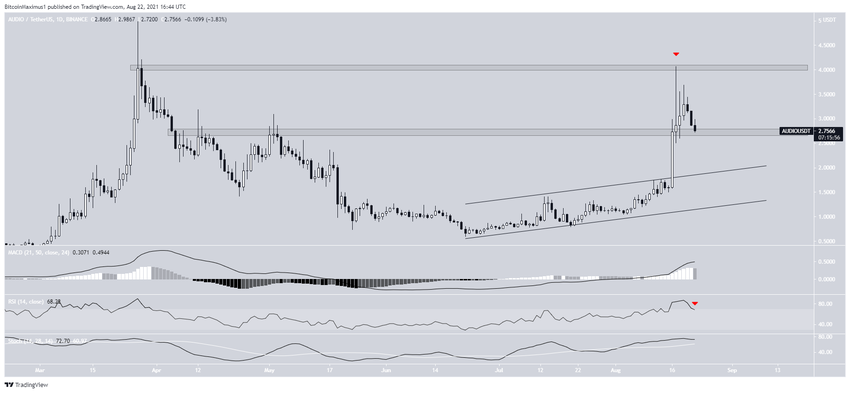 AUDIO đã tăng lên bên trong một kênh song song tăng dần kể từ ngày 22 tháng 6. Vào ngày 16 tháng 8, nó đã bứt phá khỏi kênh và tiếp tục đạt mức cao 4,07 đô la vào ngày hôm sau. Tuy nhiên, giá cao hơn không thể được duy trì và nó đã tạo ra một bấc dài phía trên (biểu tượng màu đỏ) và đã di chuyển xuống dưới kể từ đó.