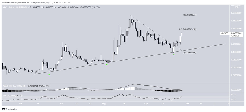 Vào ngày 22 tháng 6, giá của XDC đã đi lên theo một đường hỗ trợ tăng dần. Cho đến nay, altcoin này đã xác nhận đường này nhiều lần, lần gần đây nhất là vào ngày 21 tháng 9.