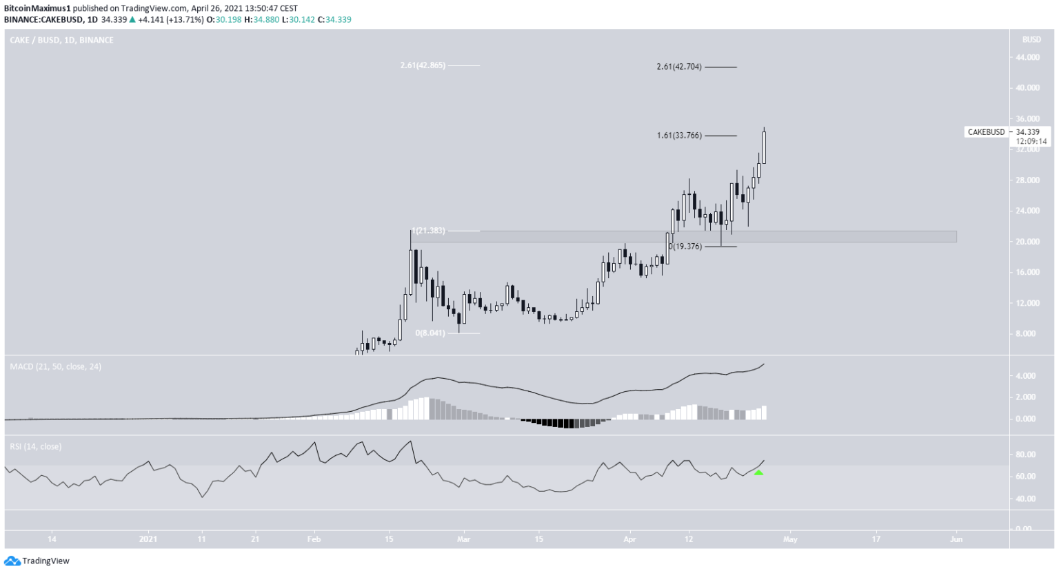 Đến ngày 26 tháng 4, CAKE đạt mức giá cao nhất mọi thời đại mới là $34.88. Điều này diễn ra ngay tại mức thoái lui Fib bên ngoài ngắn hạn 1.61.