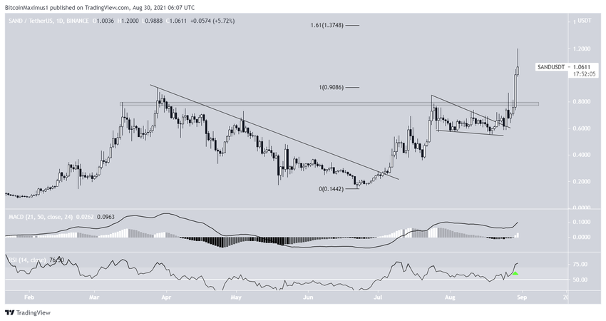 SAND đã tiếp tục đột phá ngưỡng kháng cự ngang ở mức 0.80 USD vào ngày 28 tháng 8. Ngày hôm sau mã thông báo đã ghi nhận chạm được mốc ATH tại 1.20 USD. Một bóng dài phía trên và có thể là một nến sao băng hiện đang hình thành trên biểu đồ.