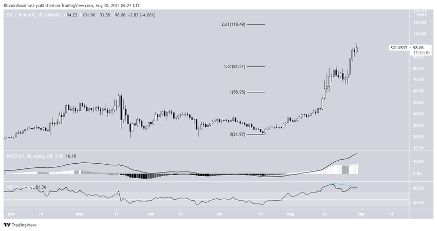 Giá của SOL đã liên tục tăng trưởng kể từ ngày 20 tháng 7. Đồng tiền này đã hình thành đỉnh đầu tiên vào ngày 21 tháng 8 ở mức 82 USD. Đỉnh này hình thành gần mức Fibo thoái lui 1.61.
