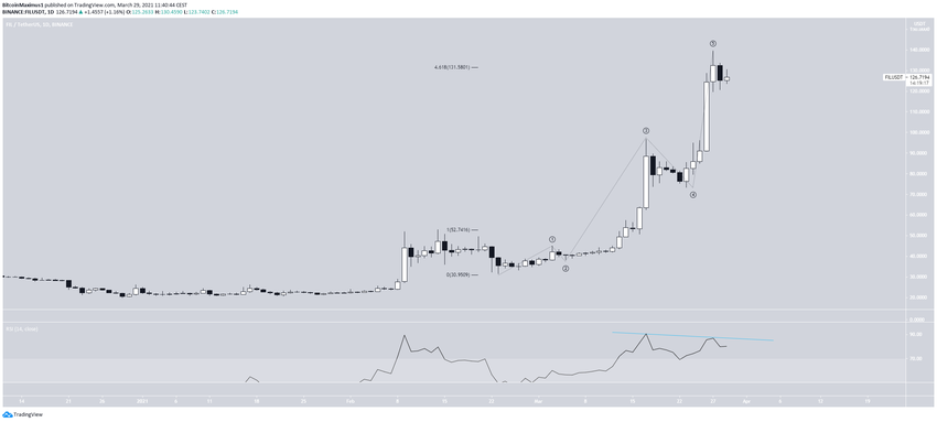 Chỉ báo RSI đã hình thành nên một sự phân kỳ giảm giá. Thế nên có khả năng FIL sẽ sớm đạt được vị trí hàng đầu trong số những altcoin tại đó.