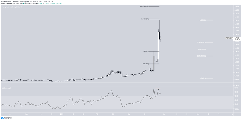 - Ngày 28 tháng 3 đánh dấu STORJ đã chạm mức giá ATH. Thế nhưng không lâu sau đó, giá đã sụt giảm tạo nên một thanh nến hình búa.