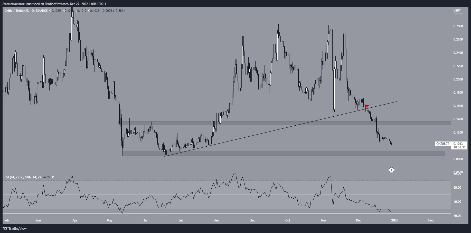 Giá CHZ đã giảm kể từ khi phá vỡ đường hỗ trợ tăng dần vào ngày 08/12 (biểu tượng màu đỏ). Ngay sau đó, chuyển động đi xuống đã gây ra sự cố từ khu vực hỗ trợ ngang 0.135 USD. Điều này dẫn đến mức thấp nhất là 0.101 USD vào tháng 12/2022.