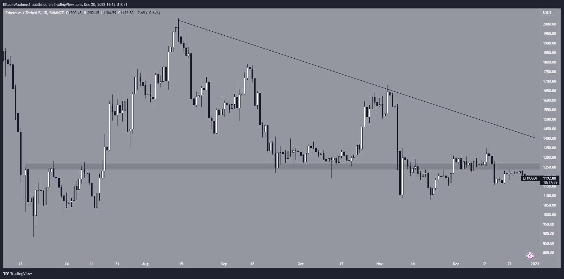 Tuy nhiên, biến động giá ETH vẫn chưa tăng vì Altcoin này đang giao dịch dưới vùng hỗ trợ ngang 1,250 USD. Đây là một khu vực quan trọng đã liên tục đóng vai trò là hỗ trợ và kháng cự kể từ tháng Sáu. Do đó, chỉ cần giá ETH còn giao dịch dưới mức này, xu hướng vẫn được coi là giảm. Nếu giá có thể bật lên và lấy lại đường kháng cự giảm dần ở mức 1,400 USD, xu hướng chắc chắn sẽ là tăng.