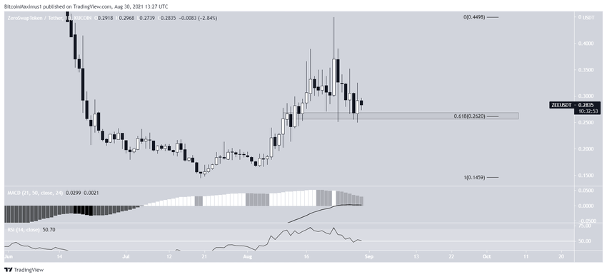 ZEE đã bắt đầu một xu hướng tăng trưởng kể từ ngày 20 tháng 7. Điều này đã giúp tiền điện tử chạm đỉnh tại 0.45 USD vào ngày 23 tháng 8. Sau đó, giá bị giảm xuống nhưng ZEE vẫn đang giao dịch trên mức Fibo hỗ trợ thoái lui 0.618 tại 0.262 USD.