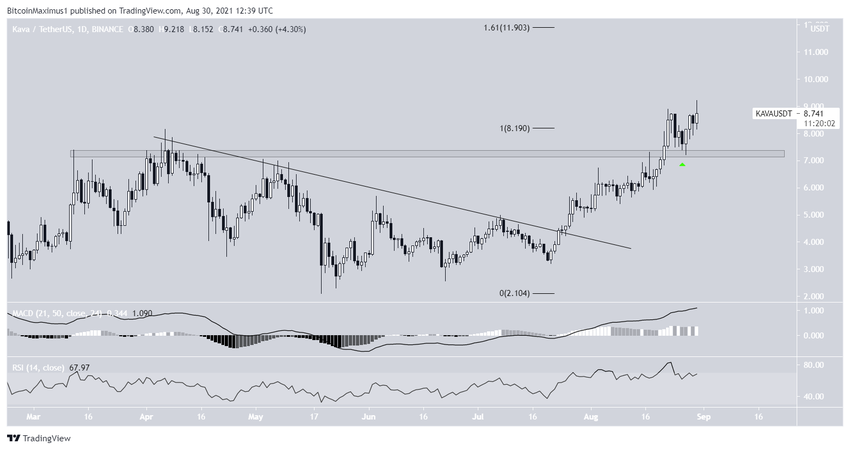 KAVA đã bứt phá khỏi đường kháng cự giảm dần vào ngày 24 tháng 7 và chạm mức ATH mới vào ngày 24 tháng 8.