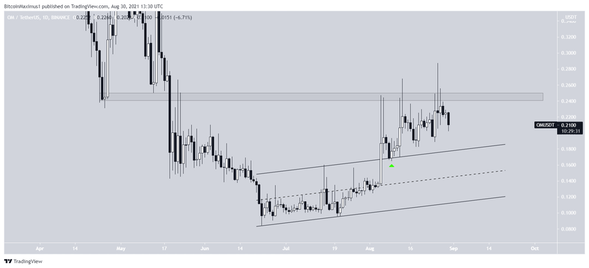 OM đã bứt phá khỏi một kênh song song tăng dần vào ngày 5 tháng 8. Hai ngày sau đó, tiền điện tử xác nhận vùng này là hỗ trợ (biểu tượng màu xanh lá cây).