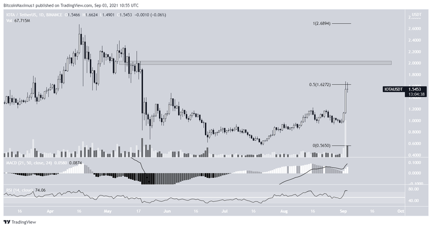 Vào ngày 20 tháng 7, IOTA bắt đầu tăng trưởng. Đến ngày 1 tháng 9, cuộc điều chỉnh giá của IOTA bắt đầu tăng tốc cho đến ngày hôm sau, IOTA phải đối mặt với mức kháng cự ở mức 1.63 USD. Mức này trùng với mức Fibo thoái lui 0.5.