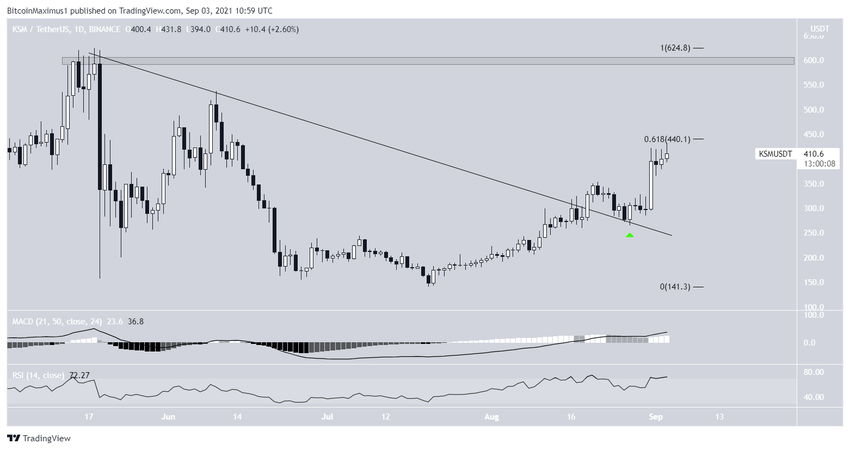 KSM đã di chuyển dọc theo đường kháng cự của xu hướng giảm kể từ ngày 18 tháng 3. Vào ngày 11 tháng 8, mã thông báo bắt đầu đột phá. Đến ngày 27 tháng 8, KSM đã kiểm tra mức này dưới dạng hỗ trợ và tiếp tục tăng.