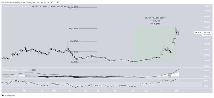 Giá của AR đã liên tục phát triển theo cấp số nhân kể từ ngày 21 tháng 7. Trong 41 ngày, giá trị của mã thông báo đã tăng tổng cộng 907%. Đến ngày 31 tháng 8, altcoin chạm được mốc ATH tại mức 69.93 USD.