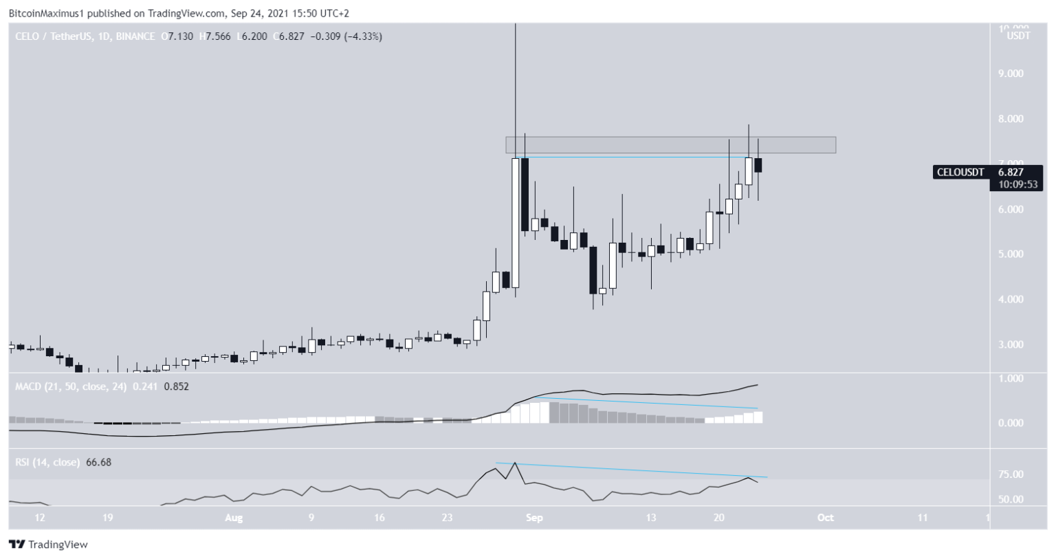 CELO đã tăng lên kể từ ngày 7 tháng 9. Vào ngày 23 tháng 9, đồng altcoin này đã đạt mức cao là 7.88 USD. Mức cao được thực hiện bên trong vùng kháng cự 7.40 USD, mà trước đó CELO đã từ chối giá vào ngày 30 tháng 8.