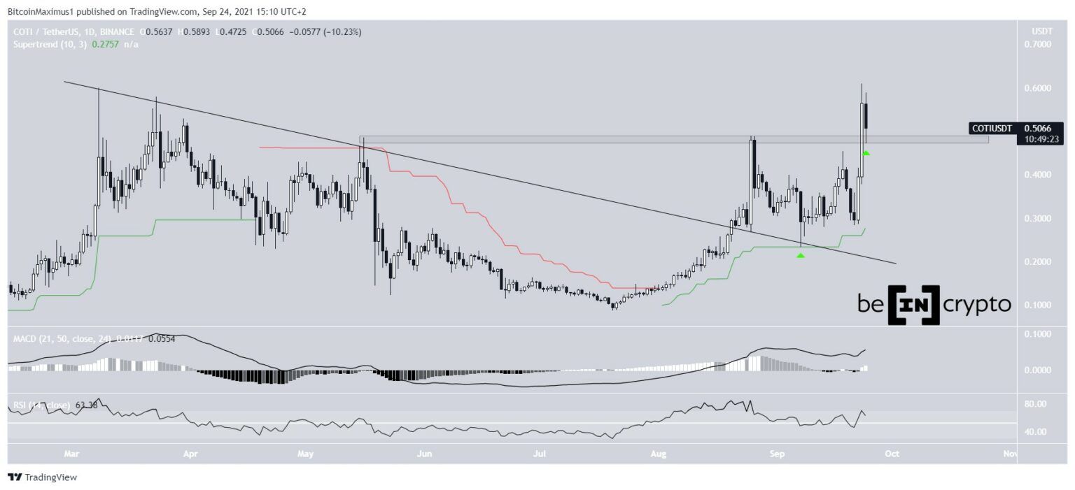 SponsoredTuy nhiên, COTI đã tăng kể từ đó và vào ngày 20 tháng 8 nó đã bứt phá khỏi đường kháng cự giảm dần. Sau khi xác nhận đường hỗ trợ vào ngày 7 tháng 9, đồng altcoin này tiếp tục tăng và đạt mức đỉnh lịch sử mới vào ngày 23 tháng 9.