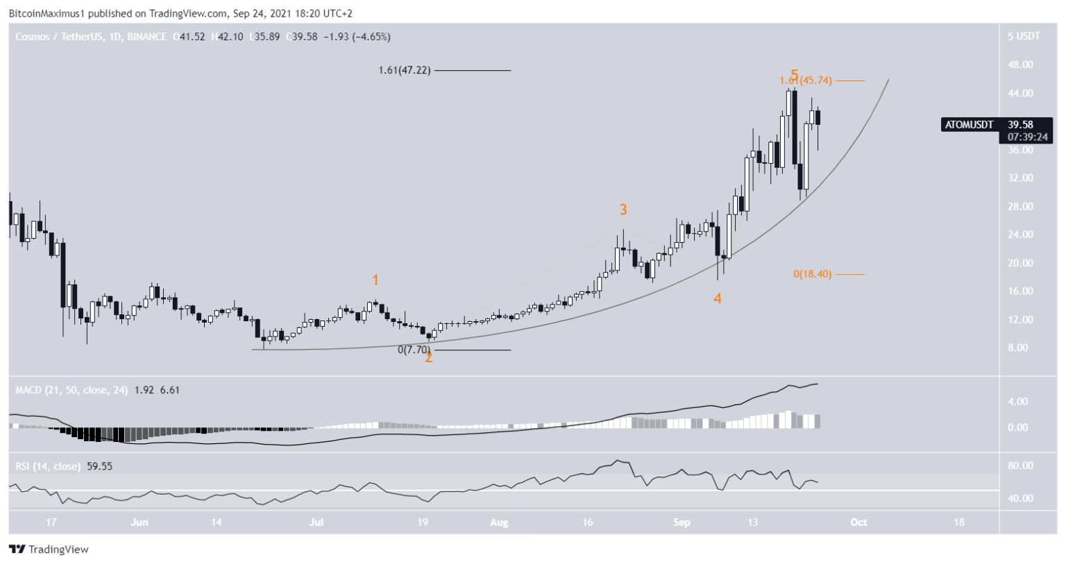 ATOM đã tăng lên cùng với đường hỗ trợ tăng dần hình parabol kể từ ngày 22 tháng 6. Xu hướng tăng đã đưa đồng altcoin này lên mức đỉnh mới tại 44.8 USD vào ngày 20 tháng 9.