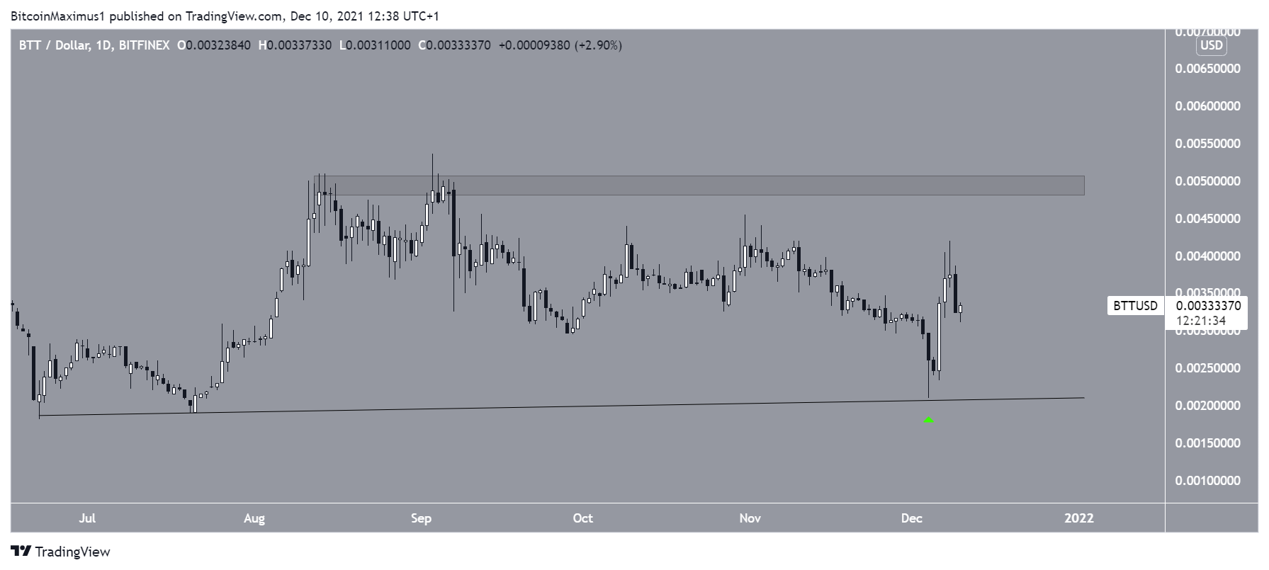 Giá BTT đã tăng kể từ đó và đang tiếp cận vùng kháng cự 0.005 USD, đã có từ tháng 8. Một chuyển động lên trên mức kháng cụ này sẽ giúp gia tăng tốc độ tăng giá hiện tại.