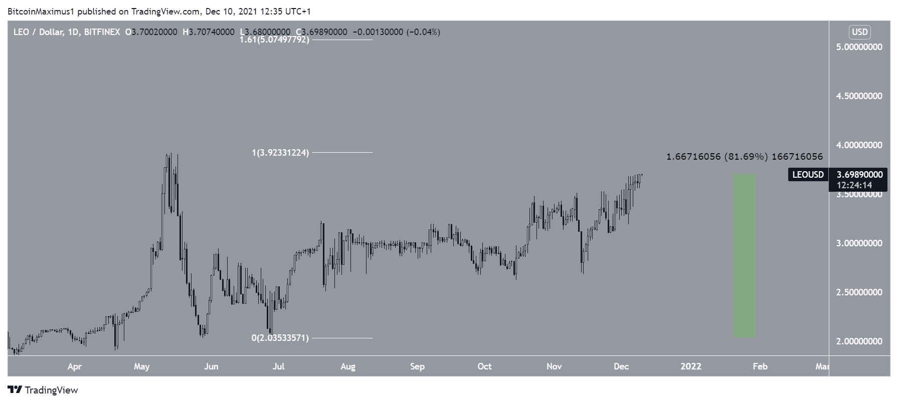 Giá LEO đã dần đi lên kể từ ngày 28 tháng 5. Tới nay, giá LEO đã tăng gần 82%. Giá LEO hiện đang tiến đến mức đỉnh cũ tại 3.92 USD.
