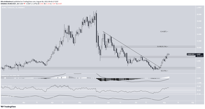 RUNE đã tăng kể từ ngày 20 tháng 7 sau khi phục hồi từ vùng hỗ trợ ngang 2.80 USD. Tám ngày sau, altcoin này đã bứt phá trên đường kháng cự giảm dần. Kể từ đó, giá đã tăng dần lên.
