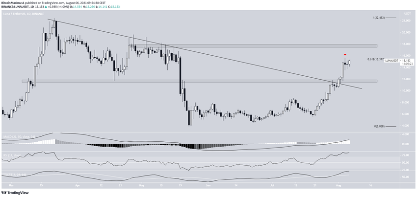 Cho đến nay, giá LUNA đã chạm đỉnh tại 15.57 USD vào ngày 4 tháng 8 (biểu tượng màu đỏ). Mức cao được thực hiện tại mức kháng cự thoái lui 0.618 Fib.