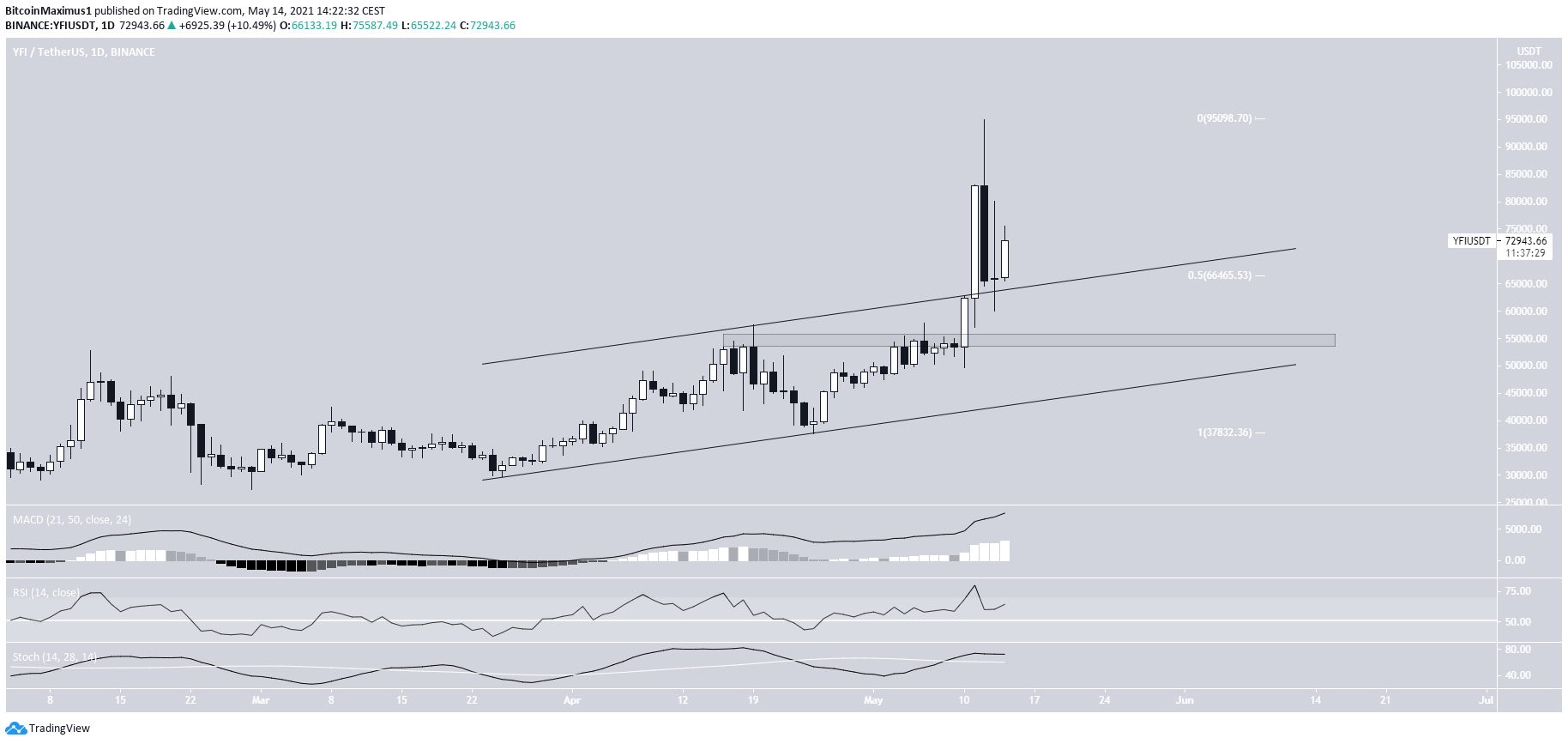 YFI đã tăng lên kể từ khi thoát ra khỏi kênh song song tăng dần vào ngày 10 tháng 5. Hai ngày sau, YFI đã đạt được mức giá cao nhất mọi thời đại mới là $95,000.