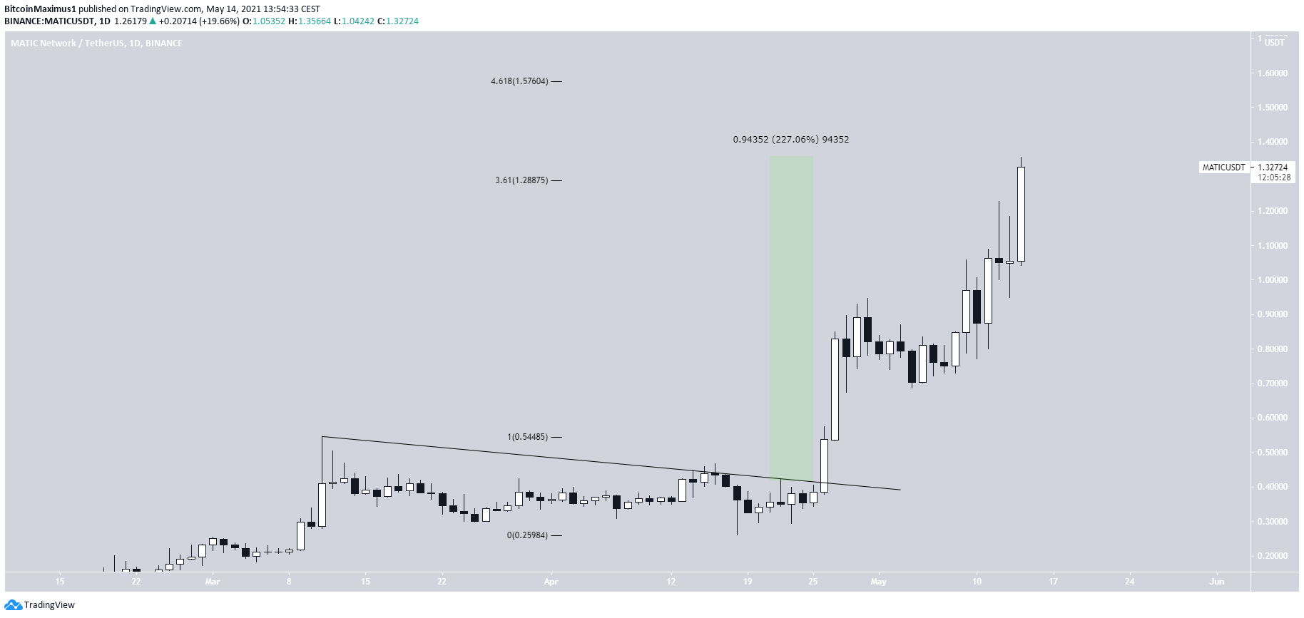 MATIC đã tăng kể từ sau khi thoát ra khỏi đường kháng cự giảm dần vào ngày 26 tháng 4. MATIC đã tăng lên 227%, đạt đỉnh giá mới tại $1.356 vào ngày 14 tháng 5.