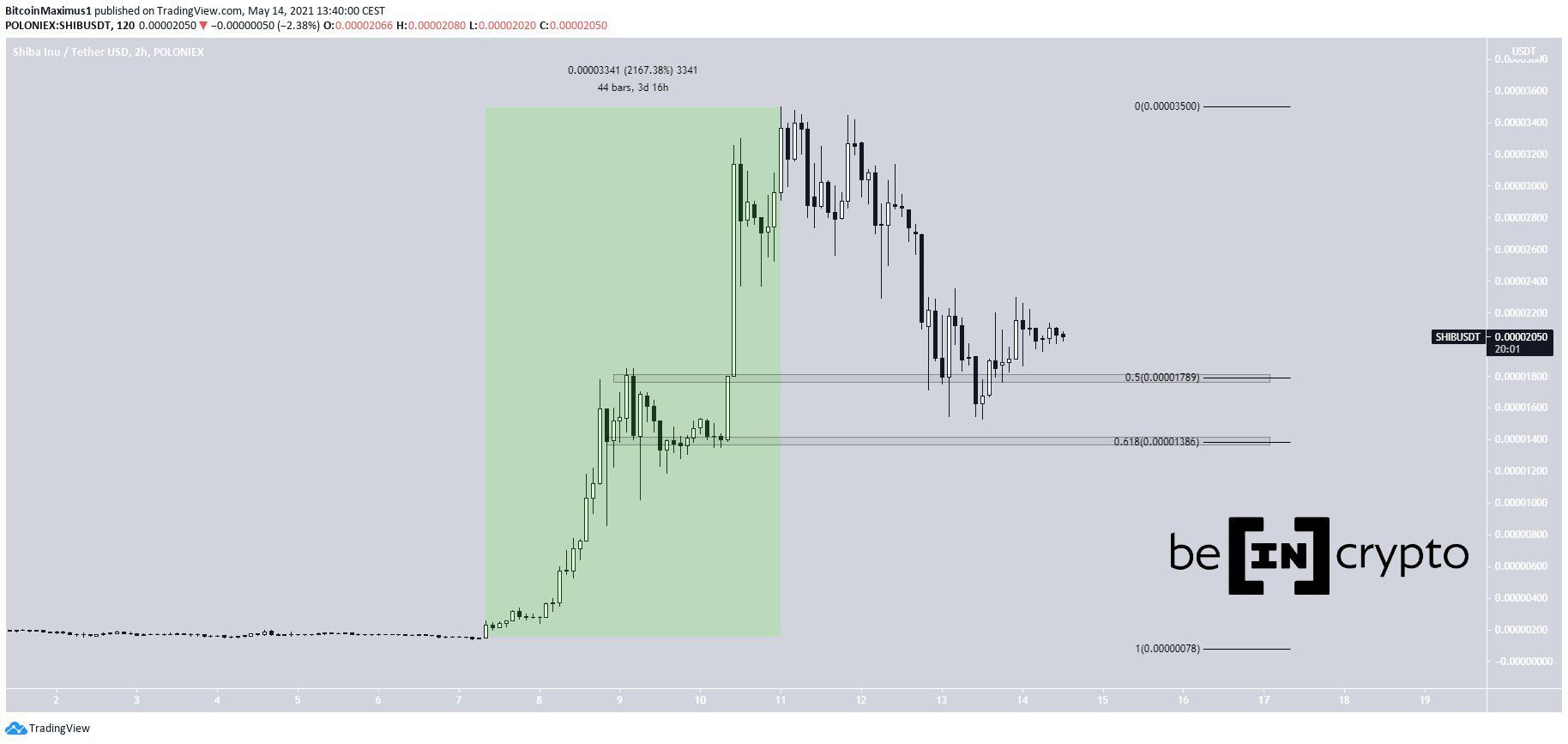 Vào ngày 13 tháng 5, giá SHIB đạt đến mức hỗ trợ thoái lui 0,5 Fib tại $0.000018 và bật lên. Tuy nhiên, sự phục hồi yếu dần cho đến nay. SHIB có thể giảm xuống mức hỗ trợ tiếp theo tại $0.14.
