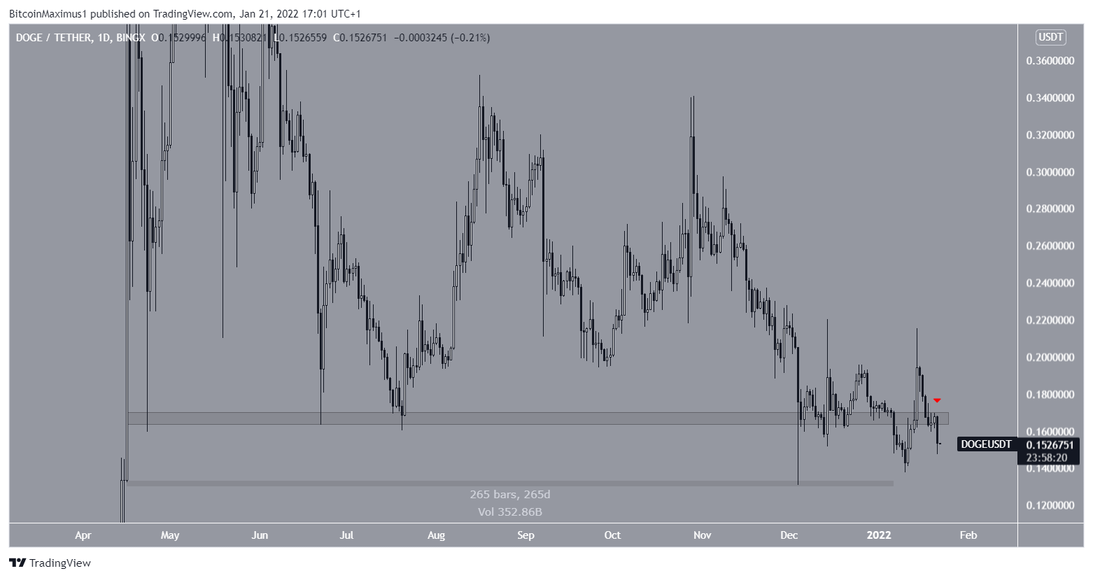 Kể từ ngày 16 tháng 4, DOGE đã được giao dịch trên vùng hỗ trợ ngang 0.166 USD. Tuy nhiên, giá DOGE đã giảm sau 265 ngày, cụ thể hơn là đã bứt phá xuống dưới vào ngày 6 tháng 1.