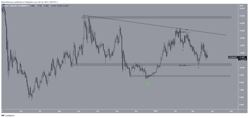 Giá ATOM đã giảm xuống dưới đường kháng cự giảm dần kể từ tháng 9/2022. Gần đây hơn, đường kháng cự này đã từ chối ATOM vào ngày 04/2/2023. Sau đó, giá đã hoàn thành cấu trúc điều chỉnh ABC. Sau khi bật lên ở vùng hỗ trợ ngang 10.30 USD, ATOM đã bắt đầu một chuyển động đi lên khác.