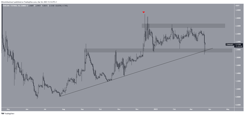 Phân tích kỹ thuật từ khung thời gian hàng ngày cho thấy giá Toncoin đã giảm dần kể từ khi đạt mức cao 2.90 USD vào ngày 14/12. Mức giảm lên đến đỉnh điểm với mức thấp 1.87 USD vào ngày 23/3.