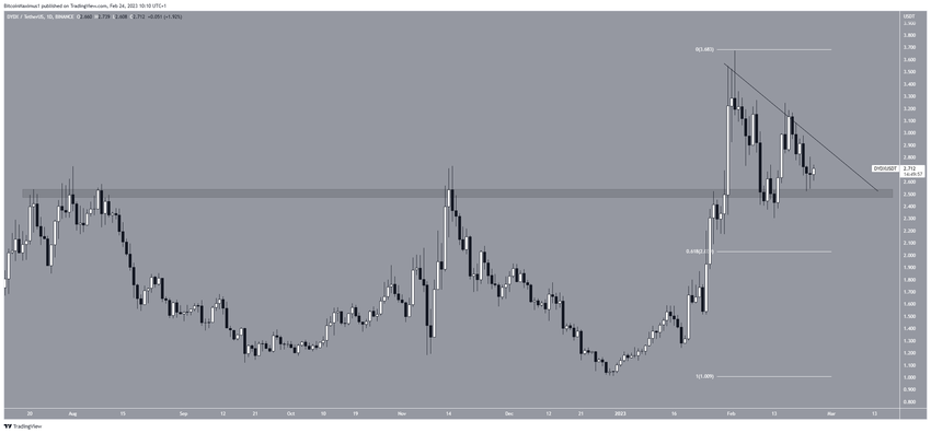 Giá DYDX của giao thức dYdX đã giảm xuống dưới đường kháng cự giảm dần kể từ ngày 30/1. Đường này đã gây ra sự từ chối vào ngày 16/2.