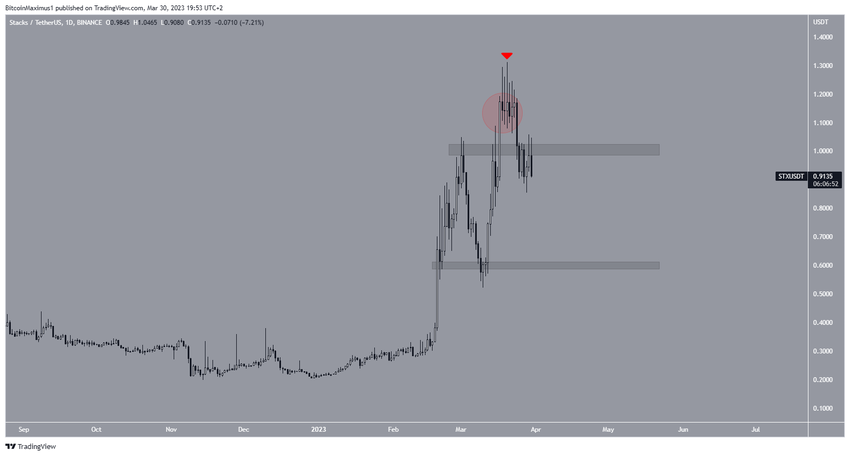 Giá STX đã giảm kể từ khi đạt mức đỉnh cao nhất hàng năm là 1.31 USD vào ngày 20/3. Cùng ngày, STX đã tạo ra một nến giảm giá có bóng nến dài phía trên. Vào ngày 30/3, giá STX đã phá vỡ khu vực nằm ngang 1 USD và xác nhận vùng này là kháng cự (biểu tượng màu đỏ). Điều này làm cho điểm đột phá trước đó là tín hiệu có độ lệch (vòng tròn màu đỏ). Nếu xu hướng giảm tiếp tục, mức hỗ trợ gần nhất tiếp theo sẽ là 0.60 USD. Tuy nhiên, nếu giá STX lấy lại khu vực 1 USD một lần nữa, nó có thể tăng lên 1.30 USD.