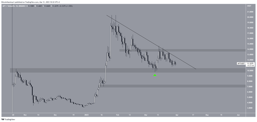 Giá APT của Aptos đã tăng kể từ ngày 10/3, khi nó bật lên ở vùng hỗ trợ nằm ngang 10 USD (biểu tượng màu xanh lục). Tuy nhiên, sức bậc yếu và giá APT gần như đã quay trở lại khu vực này một lần nữa.