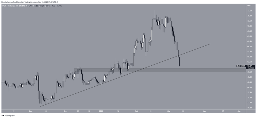 Giá DASH đã giảm kể từ khi đạt mức cao 77.90 USD vào ngày 16/2. Sau đó, Dash đã tạo ra mức cao thấp hơn vào đầu tháng 3 và tăng tốc độ giảm sau đó. Vào ngày 09/3, DASH đã phá vỡ đường hỗ trợ tăng dần. Nếu xu hướng giảm tiếp tục, vùng hỗ trợ gần nhất sẽ là 49 USD. Mặt khác, nếu Altcoin này lấy lại động lượng, DASH có thể kiểm tra lại đường hỗ trợ tăng dần ở mức 60 USD.