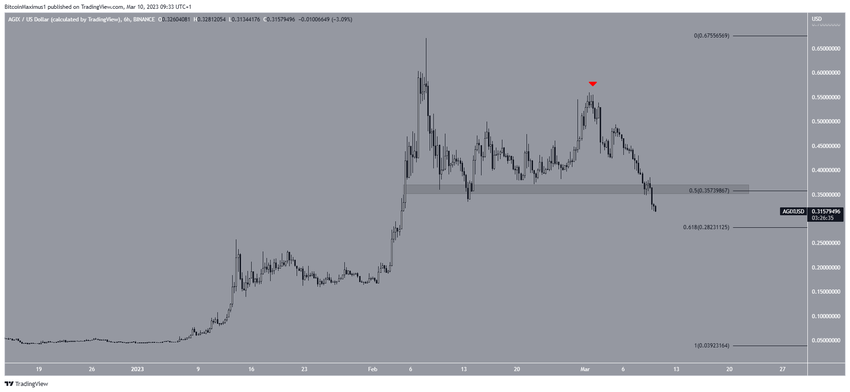 Giá AGIX của SingularityNET đã giảm kể từ khi đạt mức cao 0.67 USD vào ngày 08/2. AGIX đã tạo ra mức cao thấp hơn cho xu hướng đảo chiều (biểu tượng màu đỏ) vào ngày 01/3 và tiếp tục giảm sau đó. Vào ngày 09/3, AGIX đã phá vỡ mức hỗ trợ thoái lui Fib 0.5 ở mức 0.36 USD.