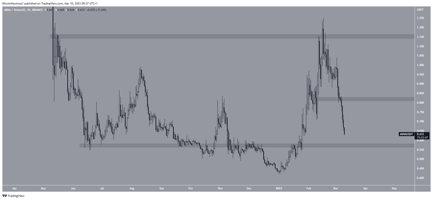 Giá MINA đã giảm mạnh kể từ khi đạt mức cao 1.25 USD vào ngày 16/2. Điều này gây ra độ lệch (deviation) trên vùng kháng cự 1.17 USD. Tốc độ giảm tăng nhanh vào ngày 03/3.
