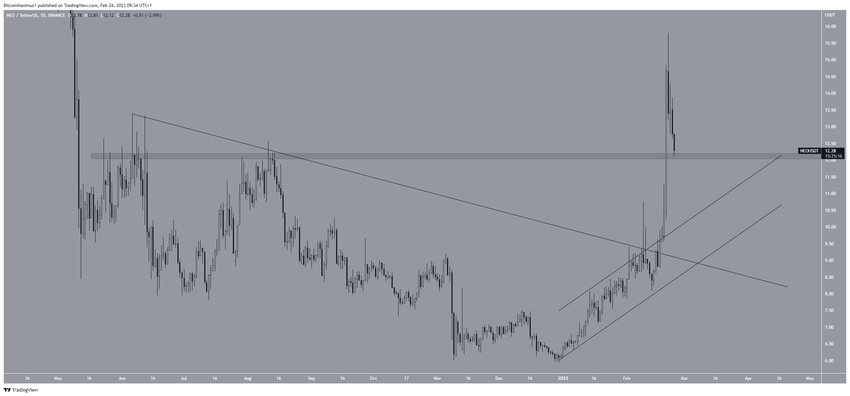 Giá NEO đã tăng kể từ khi thoát ra khỏi đường kháng cự giảm dần vào ngày 17/2. Chuyển động đi lên đã dẫn đến mức cao 15.80 USD vào ngày 21/2. Tuy nhiên, giá đã giảm kể từ đó.