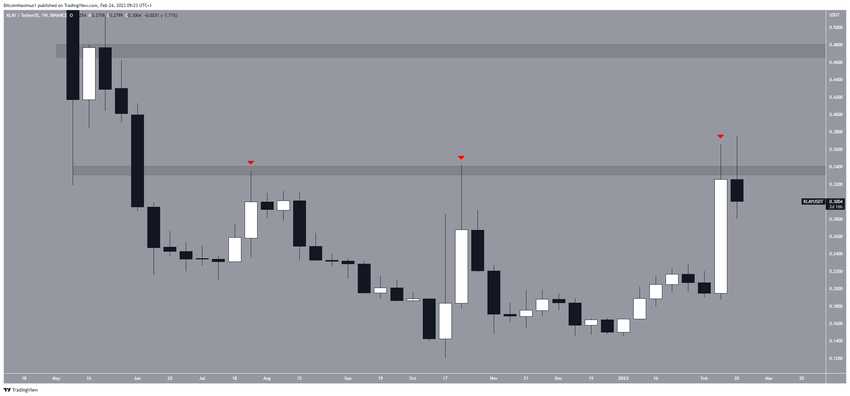 Giá KLAY đã giao dịch dưới vùng kháng cự 0.34 USD kể từ tháng 5/2022. Mặc dù đã tăng mạnh vào tuần trước, nhưng KLAY vẫn không thể đóng cửa trên mức này. Điều này có thể dẫn đến mức cao gần 0.47 USD. Tuy nhiên, nếu giá KLAY không thể bứt phá, Altcoin này có thể giảm trở lại mức hỗ trợ 0.24 USD.