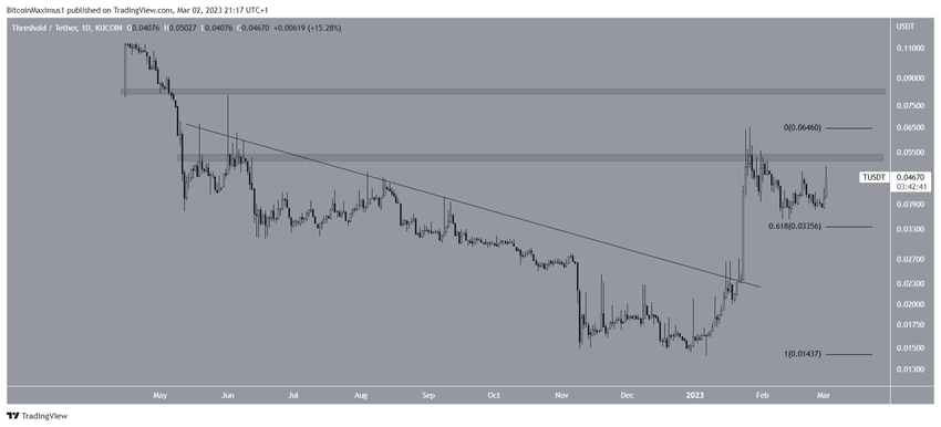 Giá Threshold đã tăng kể từ khi thoát ra khỏi đường kháng cự giảm dần vào ngày 23/1. Chuyển động đi lên dẫn đến mức cao 0.065 USD vào ngày 26/1. Tuy nhiên, Threshold, đã tạo ra một thanh nến có bóng nến dài phía trên, bị từ chối bởi vùng kháng cự 0.054 USD.