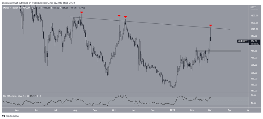 Giá Maker đã giảm xuống dưới đường kháng cự giảm dần kể từ tháng 7/2022. Đường kháng cự này đã nhiều lần từ chối Maker cho đến nay, lần gần đây nhất là vào ngày 02/3. Sau đó, Altcoin này đã tạo ra một thanh nến có bóng nến dài phía trên và MKR đã giảm kể từ đó. Nếu xu hướng giảm tiếp tục, vùng hỗ trợ gần nhất sẽ là 788 USD. Tuy nhiên, nếu giá MKR vượt ra khỏi ngưỡng kháng cự, thì có thể tăng lên 1,200 USD.