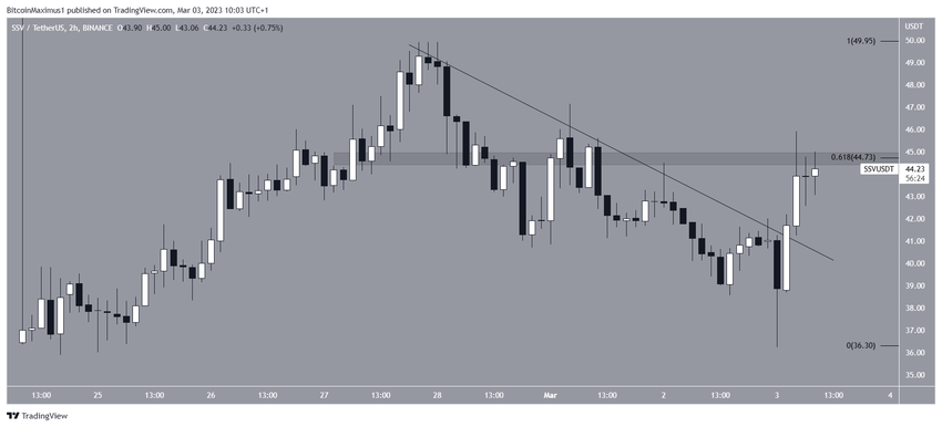 Giá SSV đã phá vỡ ngưỡng kháng cự giảm dần vào ngày 03/3, đạt mức cao nhất là 45.90 USD trong cùng ngày. Tuy nhiên, SSV đã không di chuyển trên mức kháng cự Fibo thoái lui 0.618 ở mức 44.73 USD. Nếu xu hướng tăng tiếp tục, Altcoin này có thể tăng lên 50 USD. Tuy nhiên, nếu SSV bị từ chối, nó có thể giảm xuống vùng hỗ trợ 41 USD.