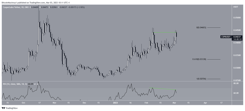 Giá Casper (CSPR) đã tạo ra mô hình hai đỉnh lần lượt vào ngày 04/2 và ngày 06/3. Bên cạnh việc là một mô hình giảm giá, mô hình hai đỉnh được kết hợp với sự phân kỳ giảm giá trong chỉ báo RSI hàng ngày (đường màu xanh lá cây). Do đó, một sự từ chối và sụt giảm là dự đoán có khả năng nhất cho chuyển động trong tương lai.