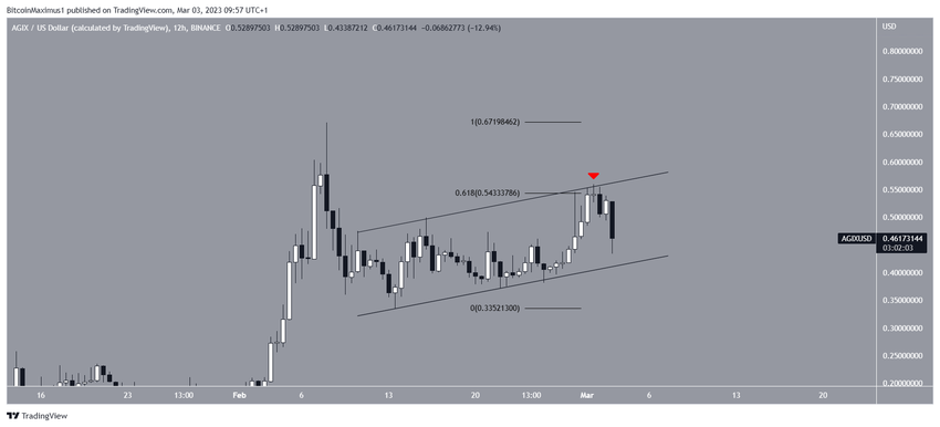 Giá AGIX của SingularityNET đã giảm sau khi đạt mức cao 0.67 USD vào ngày 08/2. Sau đó, nó bắt đầu phục hồi vào ngày 13/2. Kể từ đó, AGIX đã tăng bên trong một kênh song song tăng dần. Các kênh như vậy thường chứa các chuyển động điều chỉnh. Do đó, một sự cố từ kênh giá này sẽ là kịch bản có thể xảy ra nhất. Điều này được hỗ trợ bởi sự từ chối từ đường kháng cự của kênh vào ngày 01/3 (biểu tượng màu đỏ), cũng trùng với mức kháng cự Fibo thoái lui 0.618.