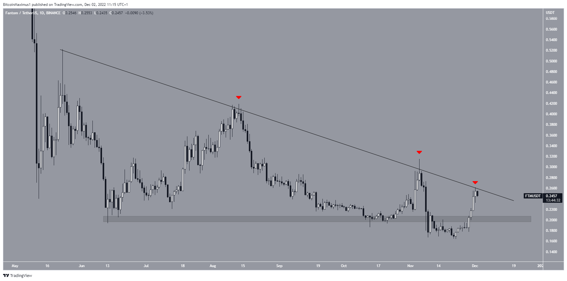 Fantom (FTM) là Altcoin tăng mạnh nhất tuần được BeInCrypto ghi nhận. Giá Fantom đã giảm xuống dưới đường kháng cự giảm dần kể từ ngày 23/5. Sau đó, Fantom đã bị từ chối 3 lần dưới đường kháng cự này (biểu tượng màu đỏ). Lần gần đây nhất vào ngày 01/12. Sau lần bị từ chối lần hai, FTM sụt giảm xuống đường hỗ trợ ngang và phá vỡ vùng hỗ trợ này để thiết lập mức thấp nhất là 0.16 USD vào ngày 22/11.