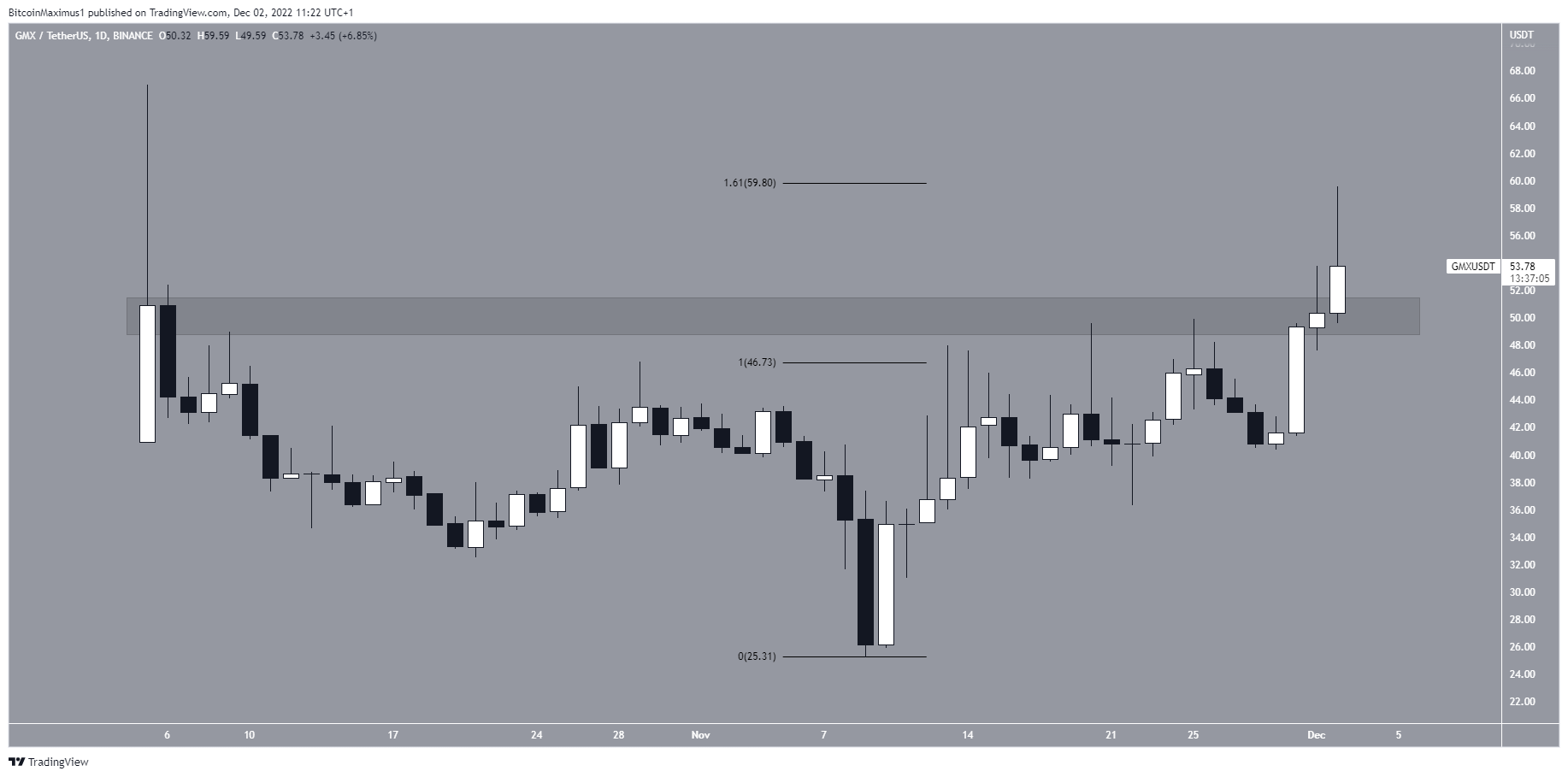 Sau Fantom, GMX là Altcoin tăng mạnh nhất tiếp theo trong danh sách này. Giá GMX đã tăng lên kể từ ngày 09/11. Xu hướng tăng vẫn có hiệu lực với 4 thanh nến ngày tăng dần. Vào ngày 30/11, GMX đã đột phá đường kháng cự ngang và giá GMX gần như đạt mức ATH mới vào ngày 02/12. Tuy nhiên, nó đã bị từ chối bởi mức thoái lui Fibo 1.61 bên ngoài ở mức 59.8 USD.