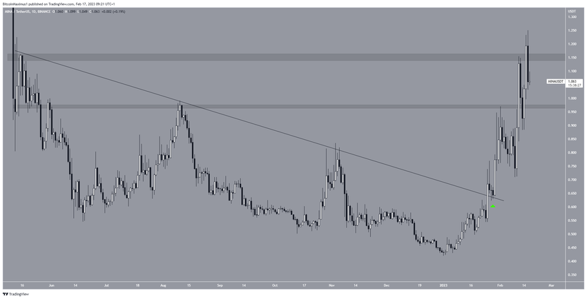Đừng thứ 2 trong danh sách các Altcoin tăng mạnh nhất tuần là Mina. Giá MINA đã tăng kể từ khi thoát ra khỏi đường kháng cự giảm dần vào ngày 25/1. Chuyển động đi lên đã dẫn đến mức cao 1.25 USD vào ngày 16/2.